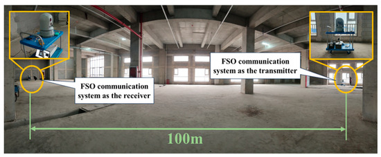 After the static tracking experiment, we carried out a dynamic experiment with the cart. Figure 10 shows the dynamic experiment on the cart. Two sets of the FSO communication systems were placed on carts 100 m apart. The signal sent by the transmitter is a pseudo-random code generated by the FPGA and encoded using 8 B/10 B code to prevent channel vacancy duration. After the systems are turned on, the carts are kept still, and the system at both ends will automatically scan and align with the opposite system under the control of the tracking program. When the optical power at both ends is stable and the system can communicate normally, it indicates that the two devices are successfully aligned. After that, the cart at the transmitter remains motionless, and the cart at the receiver is pushed back and forth to test the dynamic tracking performance of the system.