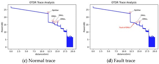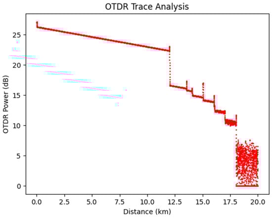 Commonly, to detect anomalies in the ODN, engineers are using OTDR, which is a technique based on the Rayleigh backscattering [12]. The concept is like a radar, so the OTDR will send a series of optical pulses into the ODN. Afterward, the backscattered signals will be recorded as a function of time that can be translated to the position of the optical fiber components such as the splitter, ONUs, and end connectors. This information is used for event analysis. Figure 1 illustrates the example of OTDR trace.