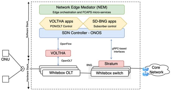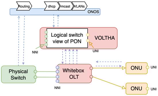 In the central office, the white-box OLT will be used, incorporating Virtual OLT Hardware Abstraction (VOLTHA), allowing the Virtual OLT (vOLT) to be managed by the Software-Defined Networking (SDN) controller, i.e., Open Network Operating System (ONOS). The vOLT can have NetConf, OpenFlow Agent, OLT Application Programming Interface (API), and ONU Management and Control Interface (OMCI) stack-connected to the ONOS SDN controller. VOLTHA hides PON-level details from the SDN controller and abstracts each PON as a pseudo-Ethernet switch easily programmed by the SDN controller.