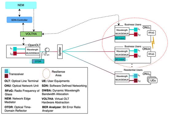 Figure 4 shows the smart resilience architecture in NG-EPON. In the north part, the OLT is connected to VOLTHA, an SDN controller such as the ONOS and NEM. These components incorporate one another using APIs and Remote Procedure Calls (gRPC) to provide seamless communication between VOLTHA, SDN controllers, and the NEM. As already mentioned, VOLTHA will activate the OLT and add to its logical switch. Moreover, the ONUs will also be added to the logical switch by VOLTHA. The SDN controllers provide centralized control and management for dynamic traffic steering, automatic failover, and real-time network adjustment. The OTDR, located at the central office, detects and localizes fiber faults, while the BER analyzer at the business users’ side captures eye diagrams to detect anomalies. Furthermore, in the south part, the users are categorized into two different groups: business users and residential users. Usually, business users have very strict SLAs and requirements. Therefore, as shown in the figure, business users such as ONU1 and ONU2 have the resilience area (indicated by the red dashed circle) which will be covered with the Radio Frequency over Glass (RFoG). The RFoG serves as a critical backup mechanism for business users in the event of a fiber fault. The RFoG allows RF signals to be transmitted over fiber optic cables, maintaining compatibility while providing the benefits of fiber optics, such as higher bandwidth and lower latency. In the proposed architecture, RFoG is activated as a secondary communication path when the primary fiber link experiences a fault or anomaly. The failover process is handled automatically by the ONU and the SDN controller, ensuring that the RFoG backup link is ready to carry traffic when needed. This mechanism will maintain continuous service, minimize downtime, and enhance overall network resilience.