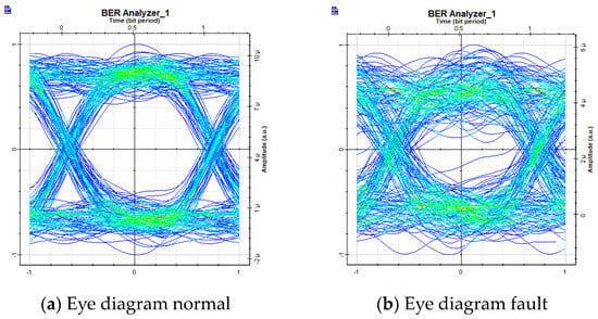 As mentioned before, this paper focuses on fault detection and localization through OTDR trace analysis and the eye diagram evaluation. Figure 5 illustrates the comparison between normal and fault conditions from these perspectives. Figure 5a shows a clear eye opening, indicating minimal noise, jitter, and distortion. In contrast, Figure 5b depicts a situation with anomalies. When there are anomalies in noise, jitter, or distortion, the eye diagram shows that the eye opening is reduced vertically and horizontally, distorting the eye shape, which indicates a very high level of noise, higher jitter, and potential issues with the transmission channel. Figure 5c shows the power attenuation for different ONUs located at different distances in a normal trace event, while Figure 5d highlights the scenario where ONU1 experiences a fiber fault. The OTDR trace results for ONU1 show a loss, with no peak detected, indicating the presence of a fault. Typically, both the OTDR trace analysis and eye diagram are tested against a predefined mask. Any violation of these masks can indicate potential fiber faults within the ODN.