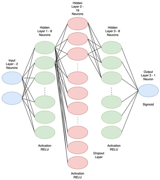 As shown in Figure 8, our MLP model has an input layer, followed by three hidden layers. The input layer has two neurons (for time and amplitude/reflection) (indicated by blue), while the hidden layers have 8, 16, and 8 neurons, (indicated by green, red, and green), respectively. All layers use the ReLU activation function, except the output layer (indicated by blue), which has a single neuron and uses the sigmoid activation function for binary classification (e.g., fault or no-fault). In total, this model has 313 trainable parameters.