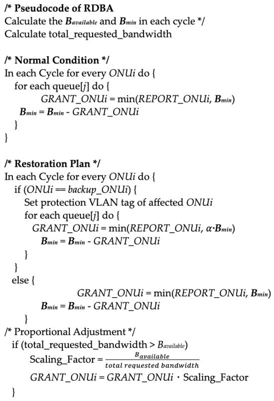 Figure 9 shows the pseudocode of the proposed RDBA. In the normal condition, the OLT calculates the available bandwidth (Bavailable) and the guaranteed bandwidth (Bmin) in each cycle. Under normal conditions in each cycle, the ONU gets the guaranteed bandwidth. If the guaranteed bandwidth (Bmin) is greater than the reported bandwidth from the queue, the granted bandwidth (GRANT_ONUi) is set to the queue’s requested bandwidth. Otherwise, the granted bandwidth is set to the remaining Bmin. The remaining Bmin is then updated by subtracting the granted bandwidth. In the restoration plan, when a fault occurs, the OLT will adjust for the backup ONU. If the current ONU is a backup ONU, the OLT sets the protection VLAN tag for the affected ONU. The Bmin is then calculated for the backup ONU, but it will be multiplied by alpha (). Here, represents the additional bandwidth allocated to the backup ONU to ensure it can handle the increased traffic, as the affected ONU now routes all data through the backup ONU via RFoG. If the current ONU is not a backup ONU, the normal condition function is applied. Moreover, to verify that the total requested bandwidth from ONUs does not exceed Bavailable due to the addition of variable , the total_requested_bandwidth is calculated as follows (3):