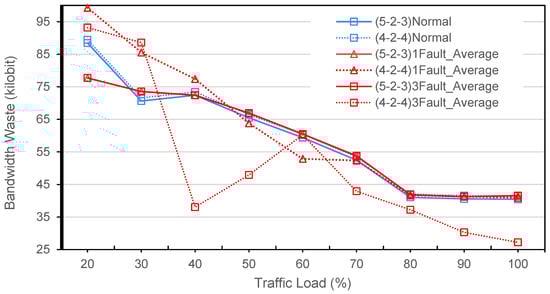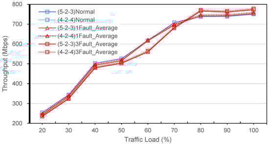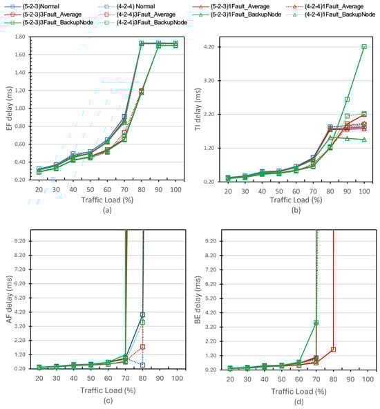 Figure 10c,d illustrate the AF and BE delay, respectively. AF delay, much like EF, shows a minimal increase with rising traffic loads in the normal scenario. BE traffic, typically given the lowest priority, shows non-congested conditions under normal conditions. However, as the traffic load increases, the limited available resources are allocated preferentially to higher-priority traffic; therefore, once the traffic load surpasses 70%, the resources available for AF and especially BE packets become increasingly constrained. When faults are present, resources are redistributed to maintain service levels for critical applications, exacerbating delays for AF and BE traffic.