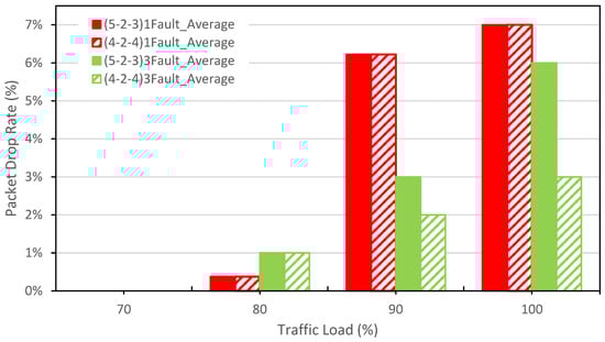The packet drop rate shown in Figure 12 shows that the drop rates remain minimal at up to 70% traffic load across all scenarios, indicating healthy network functionality under moderate loads. However, as the load exceeds 80%, packet drop rates begin to rise, especially under conditions of three faults. The packet losses occur predominantly in AF and BE traffic categories, while EF and TI packets, given the highest priority in the network, experience no packet drop. This differentiation in packet treatment highlights the network’s strategic prioritization, ensuring that critical real-time applications dependent on EF and TI traffic maintain uninterrupted service even as the system approaches or reaches full capacity.