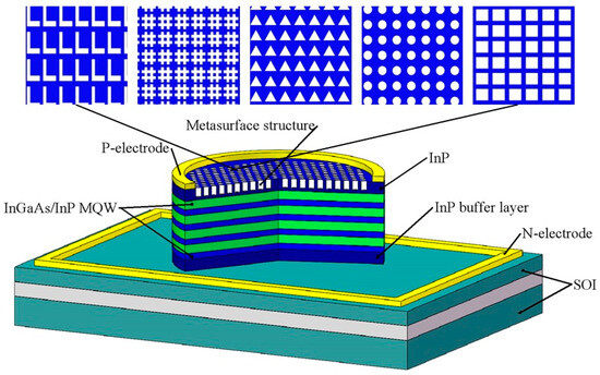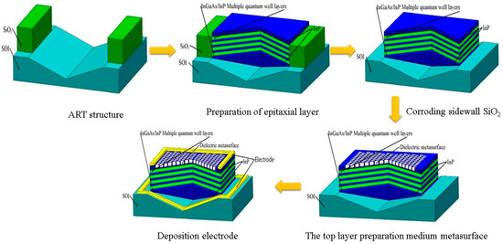 2 on the sidewalls using HF solution to prepare for the subsequent deposition of electrodes and the fabrication of the dielectric metasurface structure. The fourth step involves using electron beam lithography to pattern a specific structure on the top layer, followed by ICP etching to form the dielectric metasurface structure. The fifth step involves depositing a layer of Au on both the substrate surface and the top layer using magnetron sputtering technology as electrodes, preparing for subsequent experimental testing. In addition, the advantages of the heterogeneous epitaxy of III-V materials on silicon substrates through ART technology mainly include the following: the convenient integration of various high-mobility III-V materials and device structures; the easy realization of Si-based monolithic integration; patterned substrates can be prepared using STI templates, facilitating large-scale integration; excellent optoelectronic properties. Therefore, we intend to utilize ART epitaxy technology to grow high-quality InGaAs/InP multiple quantum well materials, with the goal of minimizing the influence of defects and lattice mismatch on device performance. Subsequently, leveraging the design parameters of dielectric metasurfaces obtained through simulation, we will design a high-performance Si-based InGaAs photodetector. This is precisely the reason why we have chosen to simulate the entire epitaxial layer produced by ART epitaxy technology, aiming to make the simulation more closely align with actual conditions and thereby thoroughly preparing for the subsequent device fabrication process.