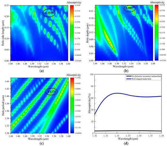 Figure 4c. Subsequently, through optimized scanning, the optimal parameters of the well-shaped metasurface structure were found to be a side length of 0.216 μm, a depth of 0.224 μm, and an array period of 1.41 μm. When compared with the absorption rate of the structure without the dielectric metasurface, the absorption rate reached as high as 67.8% at 1550 nm, as shown in