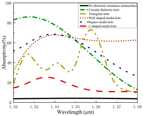 Figure 6d, when compared with the absorption rate of the structure without the dielectric metasurface, there was a relatively pronounced absorption peak near 1540 nm with an intensity of 67.8%, which was higher than that of the ordinary structure.