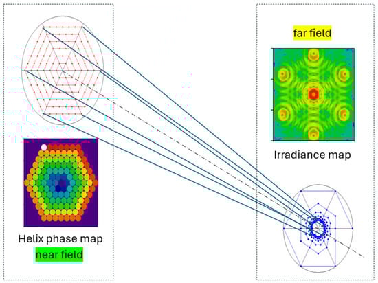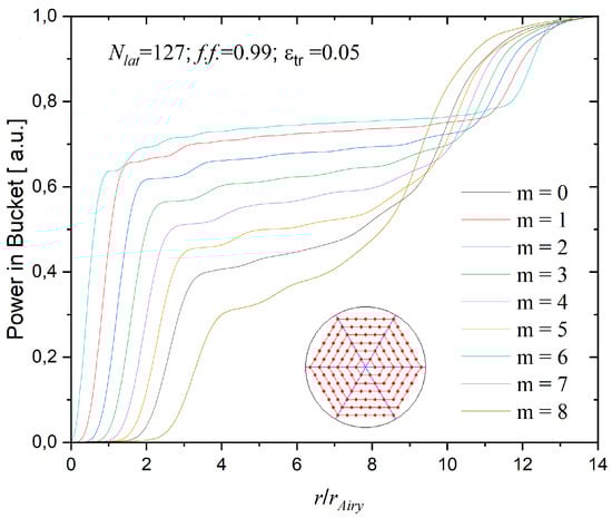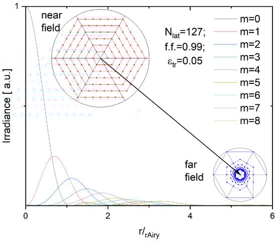 We tested the proposed OAM-CBC concept for a large hexagonal lattice consisting of Ncr = 6 outer crowns (Nlat = 127 emitters), assuming very dense packing (f.f. = 0.99). To neglect the peculiarities of diffraction, we assumed low truncation losses εtr = 0.05. Thus, an ‘almost’ Gaussian beam was emitted by an individual emitter with a very low power content at higher diffraction orders in the caustics region. The hexagonal architecture of the CBC reflects the six-folded symmetry of the 1st diffraction orders (see Figure 2).