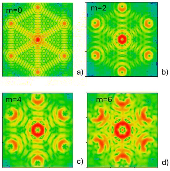 With an increase in , the amplitude profiles worsen with flattening and dissipation of power density out of the low diffraction lobes (Figure 3 and Figure 4). Moreover, above > 5, the 2D maps resemble the aberrated and scattered partly coherent beams with the minimum at the axis. These features are particularly highlighted for = 6 (Figure 2d), for which the six-fold symmetries of the vortex and hexagonal lattice overlap.