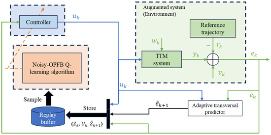 where . is the center frequency of the sinusoidal signal and is the system’s sampling rate. The entire control block diagram of applying the proposed noisy-OPFB Q-learning algorithm to the TTM tracking control system is shown in Figure 3. It should be emphasized that all the data used throughout the operation and optimization of the TTM tracking control system include only the control input and the noisy tracking error and do not depend on any of the system state information. This highlights the advantages of our proposed method over other Q-learning based methods.