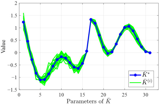 The convergence performance of the proposed algorithm is first verified. The process noise and measurement noise are assumed to be Gaussian white noise with distribution and . Considering a 10 Hz reference jitter signal and running the TTM control system shown in Figure 3 for 3 s, the tracking control trajectory is shown in Figure 4. It is observed that the controller converges after 1.75 s of learning, and the convergence curves of the controller parameters are displayed in Figure 5. The results show that the controller converges after only seven iterations, which is due to the fact that the proposed noisy-OPFB Q-learning algorithm is updated through efficient numerical solutions rather than stochastic gradient methods, ensuring a rapid and stable convergence process for the controller parameters. To further demonstrate that the trained controller is near optimal, we executed the algorithm 20 times under stochastic noise conditions and compared all solutions with the optimal analytical solution, as shown in Figure 6. The root-mean-square error (RMSE) between the near optimal solutions and the optimal analytical solution is only 0.027. This indicates that despite the introduction of approximation errors and random noise interference during the computation process, the proposed algorithm can still converge well near the optimal solution.