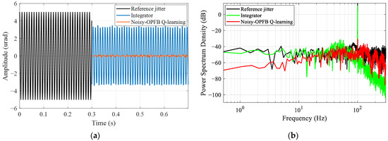 Furthermore, we verified the tracking control effectiveness of the proposed algorithm for beam jitter signals of different frequencies with measurement noise STD . The jitter tracking RMSE of the proposed algorithm was compared with that of a traditional integral controller, with the results presented in Table 1. From the results, it can be seen that with the increase in the jitter frequency, the integrator, limited by its control bandwidth, struggles to maintain tracking performance. Meanwhile, the phase lag effect causes an amplification of the jitter signal at 30 Hz, leading to a decrease in system stability. In contrast, the proposed algorithm achieved precise and stable tracking for both low and high frequencies; the RMSE is reduced up to 98.7%. Figure 11 shows a comparison example of the tracking error of a 100 Hz reference jitter. From the comparison results of power spectral density (PSD), the tracking error of the proposed method at 100 Hz is only −30 dB, which is 40.5 dB lower compared to the error of integral control. Therefore, in contrast to the traditional integrator, the noisy-OPFB Q-learning is independent of control bandwidth and can autonomously tailor the controller to various reference jitter signals, thus achieving broadband jitter tracking. This comparison underscores the effectiveness and adaptability of the proposed algorithm when applied to tilting mirror systems, making it a potent solution for beam jitter control issues.