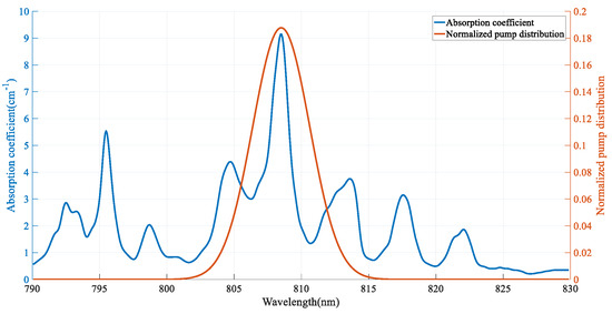The experimental setup is shown in Figure 1. The diode stack includes six bars with a FWHM spectral bandwidth of 4 nm and a central wavelength of 808 nm. Each bar is collimated by a fast-axis collimator. A 12 × 0.4 mm2 pumping line based on micro-cylindrical lens-array homogenizers is generated inside the Nd: YAG slab, top-hat along the line direction, and Gaussian across the line. The temperature of the laser crystal is controlled at 25 °C, and the pump absorption cross-section can be considered constant. Based on the micro-slice absorption method and the Beer-Lambert Law, the effective pump absorption efficiency is about 85%. The broadening spectrum of the diode stacks is shown in Figure 2. A birefringent polarizer and an electro-optic Pockels cell were used for Q-switching. The polarization of the laser output beam was parallel to the slow direction of the diode stack.