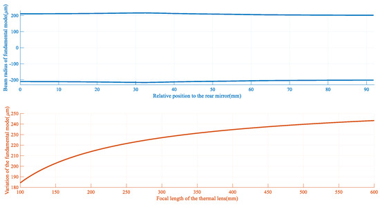 The Nd: YAG crystal has a 0.6 at.% doping concentration with dimensions of 12 × 1 × 10 mm3 and <111> direction along the 10 mm direction. The pump light 808 nm and the traveling laser 1064 nm directly pass through the two 12 × 1 mm2 end surfaces, which are polished and antireflection coated. The 12 × 10 mm2 large faces were welded to two water-cooled copper heat sinks. Indium foils were used to achieve effective and uniform thermal contact. With the line-shaped pumping and quasi-one-dimensional heat conduction, the temperature gradient was perpendicular to the pumping line. The beam radius of the base mode with respect to the rear reflector and the relationship with the thermal lens are shown in Figure 3. The blue line shows the beam radius of the base mode with respect to the rear mirror. The red line shows the variation of the base mode beam radius with the thermal lens. When the pump power is 260 W, the focal length of the thermal lens is about 150 mm and the average cavity radius is 200 μm. Combined with a concave cylindrical lens, the laser built up a stable resonator across the pumping line.
