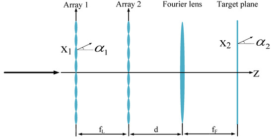 Based on ABCD-matrix formalism, a simple design rule was established as shown in Figure 4. The position of the first micro-cylindrical lens array coincides with the object focal plane of the second micro-cylindrical lens array. The target plane coincides with the focal plane of the Fourier lens. Equation (1) describes the tracing process of an incoming ray incident to the n-th micro-cylindrical lens array. Note that the height and angle of the incident ray are relative to the local coordinate system: