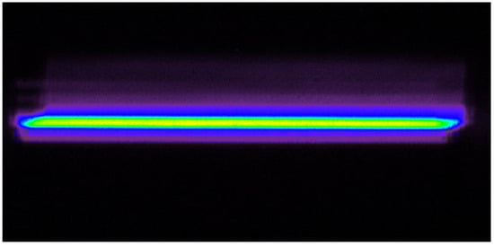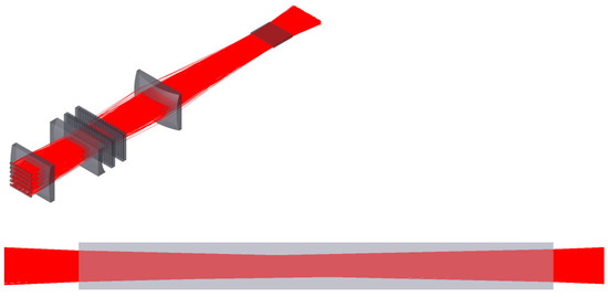 To obtain a larger depth of focus, the six-bar in the fast direction was reshaped by a cylindrical telescope system with a 2× ratio as shown in Figure 5. The incident beam was segmented into an array of beamlets by the first micro-cylindrical lens array and focused onto the second micro-cylindrical lens array. A real image with dimensions of 12 × 0.4 mm2 was generated inside the Nd: YAG by the Fourier lens. Furthermore, to show the shape and intensity distribution of the pump spot in the laser crystal more vividly, the simulation software is used to simulate it. As shown in Figure 6, this homogeneous line-shaped pumping beam showed a top-hat intensity along the line direction and a Gaussian intensity distribution across the line. The geometric length of this pumping system is about 140 mm. Compared with the traditional principle of waveguide homogenization, this new method achieves short system length while maintaining higher homogenization performance. Experimental data of the pumping line at the center of the crystal is shown in Figure 7.