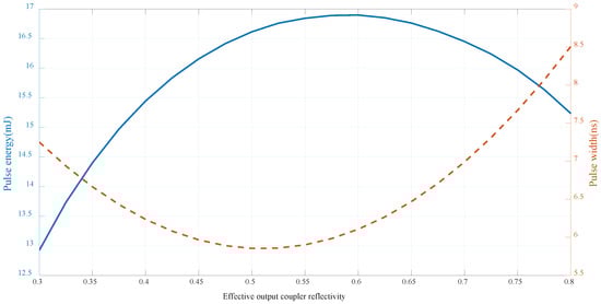 The output energy (solid curve) and the FWHM pulse width (dashed curve) against the effective output coupler reflectivity when the repetition rate is 1 kHz.