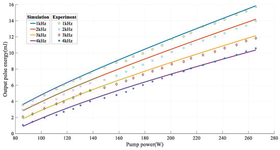 The output pulse energy as a function of different average pump power at the repetition rates of 1 kHz, 2 kHz, 3 kHz, and 4 kHz was shown in Figure 11. The results show that the output power increased approximately linearly with the pump power when the repetition frequency is constant. This means that the output power is not saturated. The optical shaping efficiency was about 80%, and the effective absorption efficiency was about 85% of the incident pump power. At the maximum pump power of 260 W, a maximum pulse energy of 10 mJ or output power of 40 W at 4 kHz was obtained. The optical-to-optical efficiency from absorbed pump power to laser output was about 22.6%, and the slope efficiency was 30%.