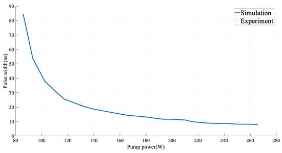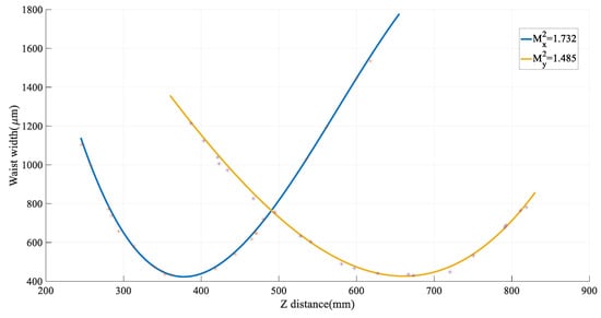 When the repetition frequency is 1 kHz, the change of the pulse width against the pump power is shown in Figure 12. When the pump power increases, the pulse width gradually decreases to 8.5 ns. Based on α-BBO, the laser beam was polarized along the unstable direction. Because the output coupler M2 is planar in the y direction, the beam waist in the y direction was always on the output mirror. To evaluate the spatial characteristics of the Innoslab laser, the beam quality of the output laser at a repetition rate of 1 kHz was measured by a laser beam analyzer (Ophir, Jerusalem, Israel, BeamSquared PY-M). The measurement results are shown in Figure 13. The beam quality M2 factors in the unstable and stable directions were 1.732 and 1.485, respectively. The pulse width, the near field, and the far field of the output laser are shown in Figure 14.