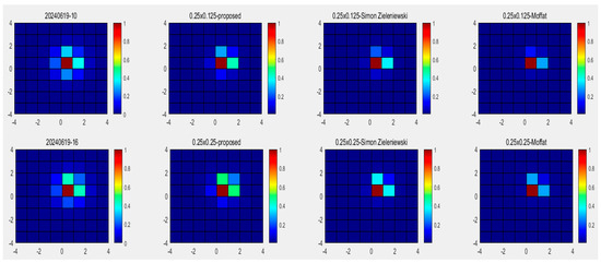 Based on the above equations, the PCCs between the simulated images and the actual detection system diffuse spot images can be calculated. The simulated image with higher similarity to the actual diffuse spot image can be selected by comparison, so as to obtain the quantitative basis of focal plane adjustment. Figure 12 shows the distribution of the five groups of diffuse spot images using three PSF modeling methods. Column 1 contains the diffuse spot images obtained with the actual detection system. Column 2 contains the simulation images using the proposed 3D multi-phase sub-pixel PSF model. Column 3 contains the simulation images using Simon Zieleniewski’s method. Column 4 contains the simulation images using the classic Moffat PSF model.