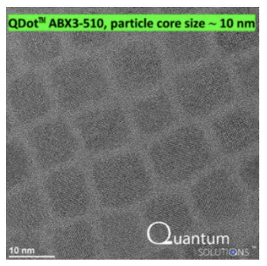 Perovskite materials have an ABX3 chemical composition, which allows for different materials with varying emission peaks based on their composition. In this study, CsPbBr3 perovskite (Perovskite ABX3 Quantum Dots 510 nm, Quantum Solutions, Southampton, UK) with an emission peak at 510 nm was used.