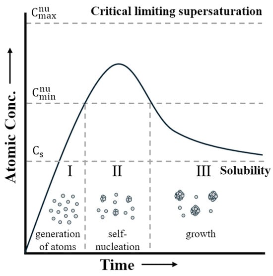 Figure 2 illustrates the changes in the concentration of quantum dots (QDs) dissolved in the solvent over time [9]. Since this study uses pre-synthesized QDs, we skipped the self-nucleation phase and focused solely on the growth process. As time passes and the concentration drops below Cs, the remaining atoms contribute only to the growth phase, causing further aggregation. This aggregation reduces the overall photoluminescence properties of the nanocrystals. To mitigate this, PMMA is introduced as a polymer matrix, which stabilizes the QDs by preventing them from clumping together. The polymer’s chain structure helps ensure that the QDs remain well dispersed, preserving their optical properties [10,11].