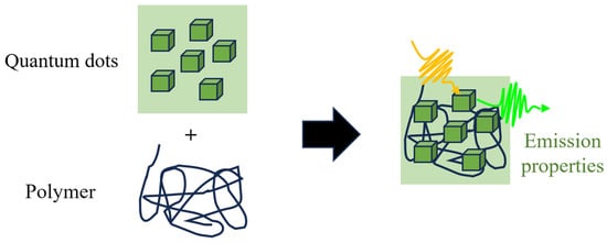 As shown in Figure 3, by mixing QDs with polymers, individual nanoparticles can bind to the polymer chains, preventing agglomeration [12,13]. This approach can improve emission properties. Owing to the characteristics of QDs, the aggregation of the nanoparticles was mitigated by mixing them with a polymer (PMMA, Sigma-Aldrich, St. Louis, MO, USA). The fabrication process of the coating material is illustrated in Figure 4.