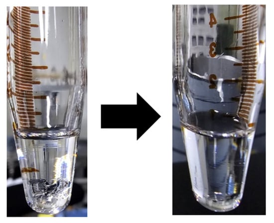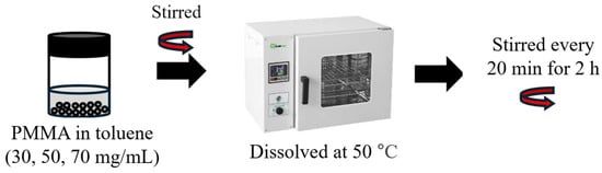 PMMA was dissolved in toluene to prepare the perovskite as the mixture. This process involved the preparation of solutions at three different concentrations: 30, 50, and 70 mg/mL. While PMMA is inherently soluble in toluene, the dissolution process was accelerated and optimized by heating in a 50 °C oven. The mixture was vigorously stirred at 20 min intervals over a period of 2 h to ensure complete dissolution of the particles. The processes before and after the dissolution are shown in Figure 5.