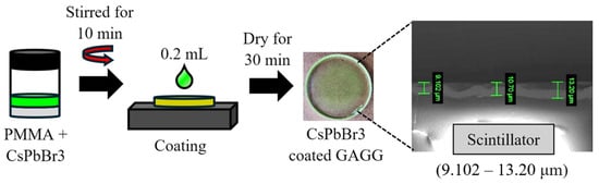 The PMMA dissolved in toluene and perovskite was mixed at a 1:1 ratio (0.1 mL each) by stirring for 10 min. The resulting solution (0.2 mL) was spread onto the scintillator, and the solvent was removed by allowing it to dry for 30 min. The coating process and final form are shown in Figure 6 [14].