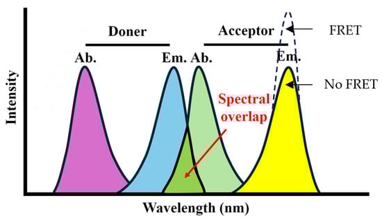 However, FRET occurs under resonance conditions [15] when a spectral overlap exists between the emission spectrum of the donor and the absorption spectrum of the acceptor and when the distance between the donor and the acceptor is in the range of 1–10 nm.