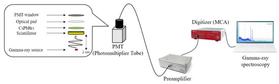 Additionally, to evaluate the scintillation increase demonstrated in the photon-counting experiment, we conducted gamma spectroscopy with the highest increase rate combination of concentration and scintillator for each source (Cs-137 and Co-60). The experimental setup is illustrated in Figure 9.