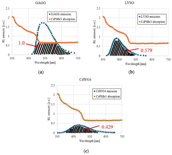 The spectral overlap areas between the emission wavelengths of each scintillator and the absorption wavelengths of the perovskite were normalized based on the GAGG values. The calculated values for GAGG, LYSO, and CdWO4 were 1.0, 0.579, and 0.429, respectively. It was predicted that the photon-counting values for the coated scintillators would follow the trend in these calculated values, showing an increase in the photon count compared with the uncoated scintillators.