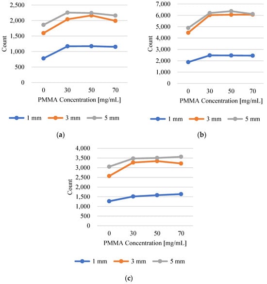 Figure 11 and Figure 12 present the photon-counting data. Overall, it was determined that a concentration of 50 mg/mL resulted in the greatest increase in the photon count. The reason for the distinct differences in the rate of increase with varying concentrations is the varying levels of transmittance and absorbance, which are dependent on the concentration ratio of the CsPbBr3 and PMMA mixture. Consequently, the optimal transmittance was observed when the CsPbBr3 to PMMA ratio was 1:5.