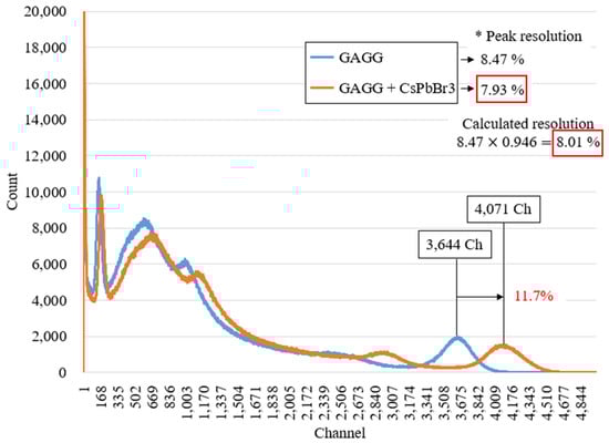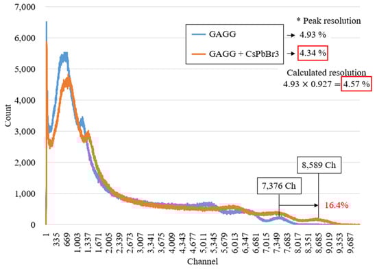where R is the energy resolution of the scintillation detector, is the number of photoelectrons produced in the PMT, and v(M) is the PMT gain, which is a fixed value determined by the specific PMT used. Therefore, the energy resolution was primarily influenced by the number of photoelectrons generated by the PMT. Upon substituting the derived value of 11.7% from Figure 14 into Equation (3), it was revealed that coating the scintillator with the perovskite material improved the resolution by a factor of 0.946 compared with the original resolution. This resulted in an estimated value of 8.01%, which closely matched the measured value of 7.93% as shown in Figure 14.