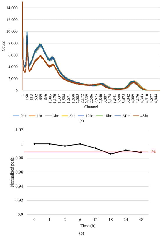 Performance sustainability achieved by shifting the peak of the Cs-137 source. (a) shows the energy spectrum results, and (b) presents the channel values of the peaks at each time point, normalized to the values at time 0 h.
