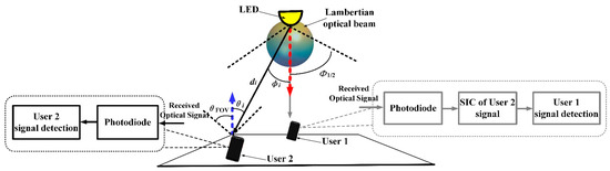 As shown in (7), both users receive the signal for the other user, in addition to their own information signal. In the downlink NOMA VLC, the data signal for the far user, i.e., , is allocated more electrical power than the data signal for the near user, i.e., . In this way, the near user must first successfully decode and then apply successive interference cancellation (SIC) to recover its information signal .