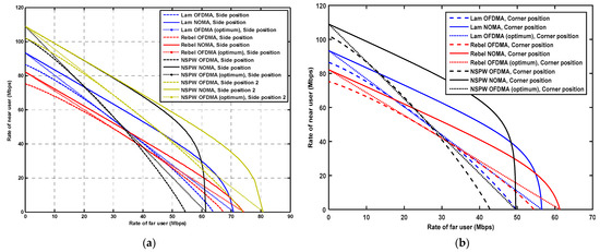 At the same time, the obvious capacity region gain can be achieved by applying NOMA in VLC with the Lambertian optical beam configuration. In particular, when the near user rate is fixed at 60 Mbps, the far user rate for the OFDMA, optimum OFDMA, and NOMA is 25.2 Mbps, 25.3 Mbps, and 33.2 Mbps, respectively. This indicates that an achievable gain of up to about 8.0 Mbps could be provided by NOMA, compared to the benchmark original OFDMA, in the Lambertian situation. In contrast, in the situation of the non-Lambertian LUXEON Rebel light beam configuration, the achievable gain for the NOMA solution is comparatively limited, as shown by the red lines in Figure 4a. Specifically, when the near user rate is fixed at 60 Mbps, the far user rate is 18.8 Mbps, 20.0 Mbps, and 22.1 Mbps, respectively, for the OFDMA, optimum OFDMA, and NOMA, which means that the achievable gain is just 3.3 Mbps when employing NOMA. This phenomenon is mainly due to the fact that the maximum radiation intensity does not appear in the normal direction of the LED source any longer, and more optical power is emitted to the surrounding area, which further results in a reduction in the channel quality difference between the VLC near user and the VLC far user. In contrast, in the situation of the non-Lambertian NSPW beam configuration, the achievable gain for the NOMA solution is impressive, as shown by the black lines in Figure 4a. Similarly, with the near user rate of 60 Mbps, the far user rate is 27.7 Mbps, 27.5 Mbps, and 46.5 Mbps, respectively, for the OFDMA, optimum OFDMA, and NOMA, which means that a data rate gain of up to about 19 Mbps could be achieved by utilizing NOMA under the NSPW emission beam configuration. As mentioned above, considering the rotational asymmetry of the NSPW beam configuration, the performance for the far user at the additional side, i.e., (0.5, 2.5, 0.7) m, must be studied to provide sufficient numerical observation. Thanks to the further enlarged visible light channel quality difference between the near user and the VLC far user, the attainable data rate gain is further varied to about 12.3 Mbps, with the VLC near user rate of 60 Mbps. In particular, the respective far user rate is 36.4 Mbps, 36.3 Mbps, and 48.7 Mbps, respectively, for the OFDMA, optimum OFDMA, and NOMA, as shown by the yellow lines in Figure 4a.