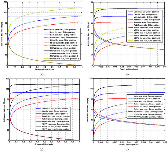 Comparison of achievable data rate versus power splitting factor for 6G NOMA VLC with distinct optical beam configuration: (a) far user located at the side position, (b) locally zoomed-in results for the case of the far user located at the side position and (c) the far user located at the corner position, and (d) locally zoomed-in results for the case of the far user located at the corner position.