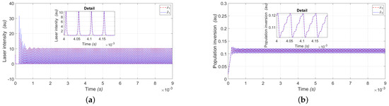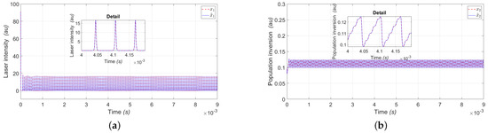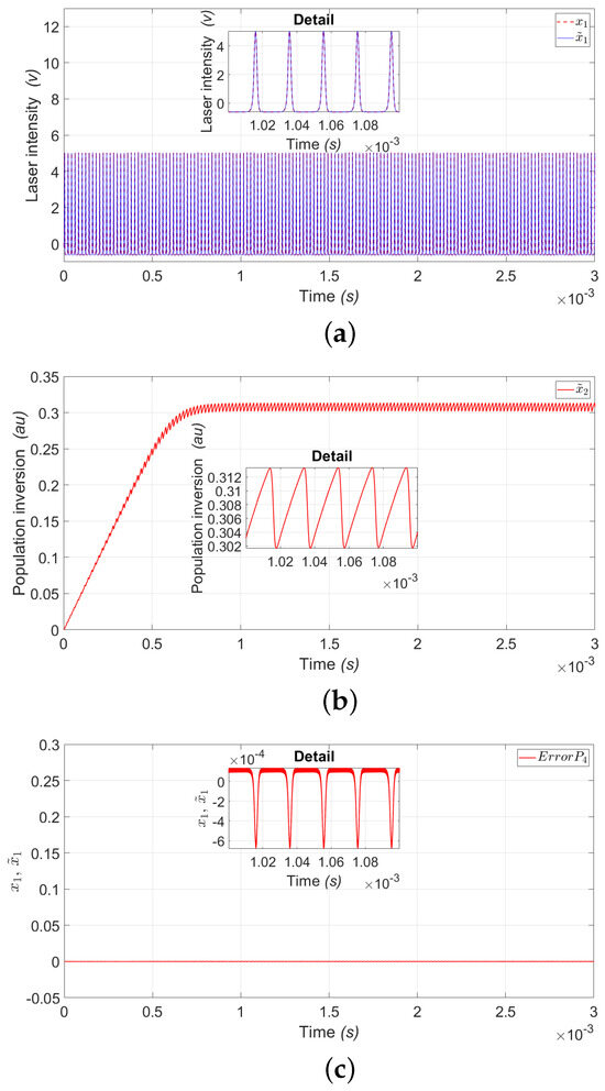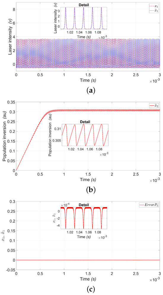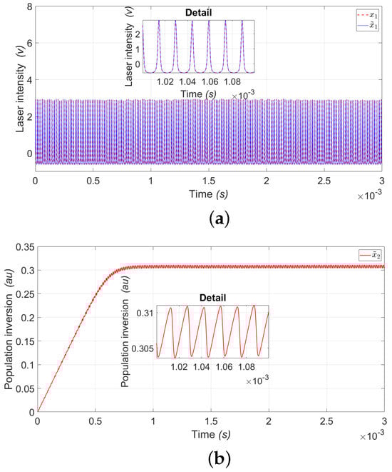 Figure 4a shows the estimation of the laser intensity () represented by the variable (), where we can see the convergence of the observer and Figure 4b shows the estimation of the population inversion () represented by the variable (); both variables are for period .