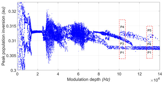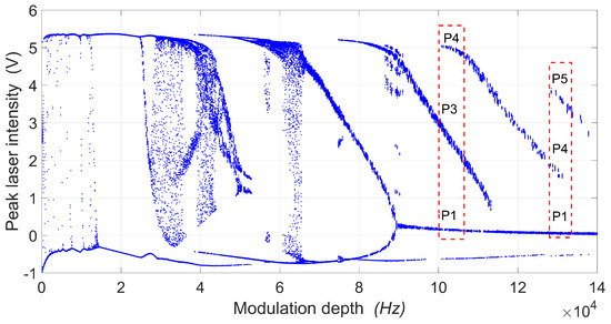 Figure 1 shows an extract of the numerical laser intensity bifurcation diagram, which was obtained through the time series of the multistable region corresponding to the coexistence of attractors, shown by (, , , ), for a modulation frequency of 80 Hz. The complete bifurcation diagram can be consulted in the work [54].