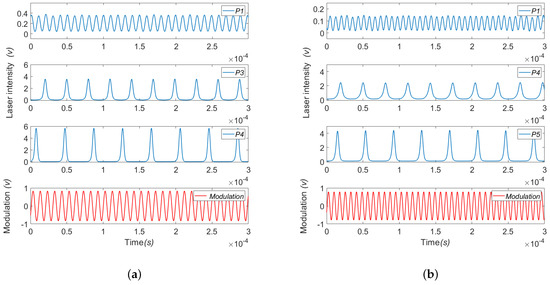Time series of the laser intensity of the EDFL showing the coexistence of period 1 (P1), period 3 (P3) and period 4 (P4) for (a) the modulation frequency kHz, as indicated by the red dashed line on the left side of Figure 7, and the coexistence of period 1 (P1), period 4 (P4) and period 5 (P5) for (b) modulation frequency kHz, characterized by the red dashed line on the right side of Figure 7. In both cases, the lower trace shows the modulation signal with V.