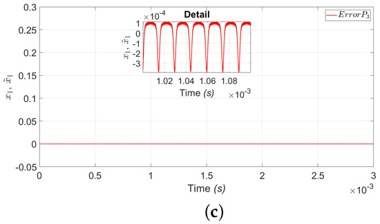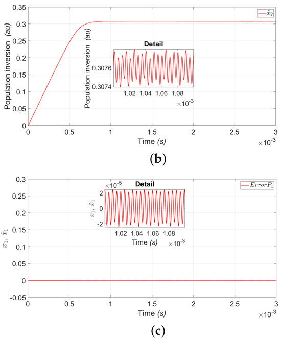 Figure 11a shows the estimation of the laser intensity () represented by the variable (), although the variable can be measured physically. Figure 11b shows the estimation of the population inversion (), and Figure 11c shows the estimation error between and where we can see that the error is very close to zero, which guarantees the good estimate of the population inversion variable, for period .