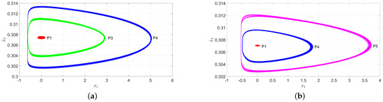 Figure 14a shows the phase space for periods P1, P3, and P4 of a multistable region, shown in Figure 7 with a red box at a modulation frequency of kHz. Similarly, for Figure 14b, the phase space of the periods P1, P4, and P5 of a multistable region is observed in Figure 7 with a red box at a modulation frequency of kHz. It is worth mentioning that although the periods are at different frequencies, the state observer was able to estimate each period of the multistable regions.