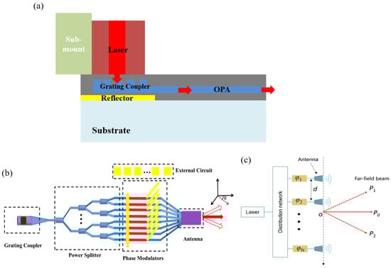 (a) Side view of the OPA with a hybrid-integrated laser. (b) Schematic diagrams of the proposed grating lobe-free beam steering chip. (c) Modeling of the far-field beam steering.
