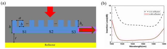 where CEλn is the coupling efficiency of the n-th wavelength λn. The coupling efficiency is the transmission of the laser mode coupled to the single mode of the silicon waveguide. The FOM is the maximum of the average coupling efficiencies over a wavelength range. The grating coupler is optimized at the center wavelength of 1550 nm and with the 3 dB bandwidth of 100 nm as optimal target values. The calculated insertion loss is larger than 4 dB without the reflector, as shown in Figure 2b. To further improve the coupling efficiency, a metal reflector is set underneath the chirped grating coupler, of which the spacing t is 900 nm. The optimized results are verified by using the 3D-FDTD method, and the parameters of the grating coupler are shown in Table 1. The coupling efficiency can be up to 0.45 dB (90%) and the 3 dB bandwidth is about 90 nm with the metal reflector underneath the silicon oxide layer, which has a higher performance than the conventional grating coupler.