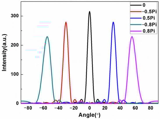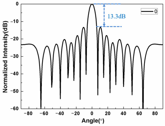 Figure 3 shows the calculated optical far-field distribution of the proposed OPA with half-wavelength spacing. The special design can fully eliminate the high-order grating lobes in a 180°-wide field of view (FOV). As shown in Figure 4, there is no grating lobe in the FOV and the side-lobe suppression ratio is about 13.3 dB.