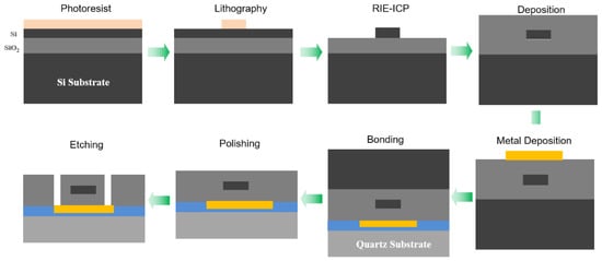 The OPA chip is fabricated on the SOI platform with a top silicon layer of 220 nm thickness and a buried oxide layer of 2 μm thickness. The main fabrication flow is shown in Figure 5. Firstly, the electron beam lithography (Raith150 II) is used to define the patterns on the photoresist layer. The device patterns are then transferred onto the silicon layer using inductively coupled plasma reactive-ion etching (ICP-RIE) with a gas mixture. The silica top cladding layer is 900 nm thick, which is consistent with the high coupling efficiency of the grating coupler, and is deposited via plasma-enhanced chemical vapor deposition (PECVD). The gold/titanium of 5 nm/100 nm thickness that are utilized as thermal heaters, and the gold utilized as pads for wire bonding, are developed using electron beam evaporation. Then, the SOI chip is flip bonded with the quartz substrate and the upper silicon substrate is removed and polished with the chemical mechanical polishing (CMP) method. Finally, the lithography and ICP are used to etch the silicon oxide, which can open the windows above these metal pads.