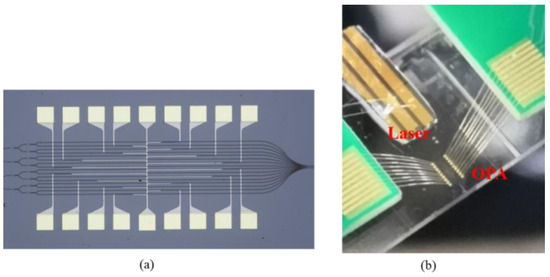 Figure 6a shows the optical microscope image of the fabricated 16-channel OPA. The phase shifters are based on thermo-optic effect. The metal pads are wire-bonded to the external printed circuit board (PCB) connected to the multi-channel voltage controller. The commercial III–V DFB laser chip coupled and packaged with the silicon OPA chip, as shown in Figure 6b.