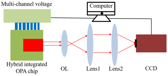 The near-infrared charge coupled device (CCD) with a Fourier imaging system is utilized to capture the steering beam in the far-field, as shown in Figure 7. The far-field optical beam distribution is imaged with a 4f system, including the objective lens (OL), two lenses (Lens1, Lens2) with focal lengths of 20 cm and the infrared CCD.